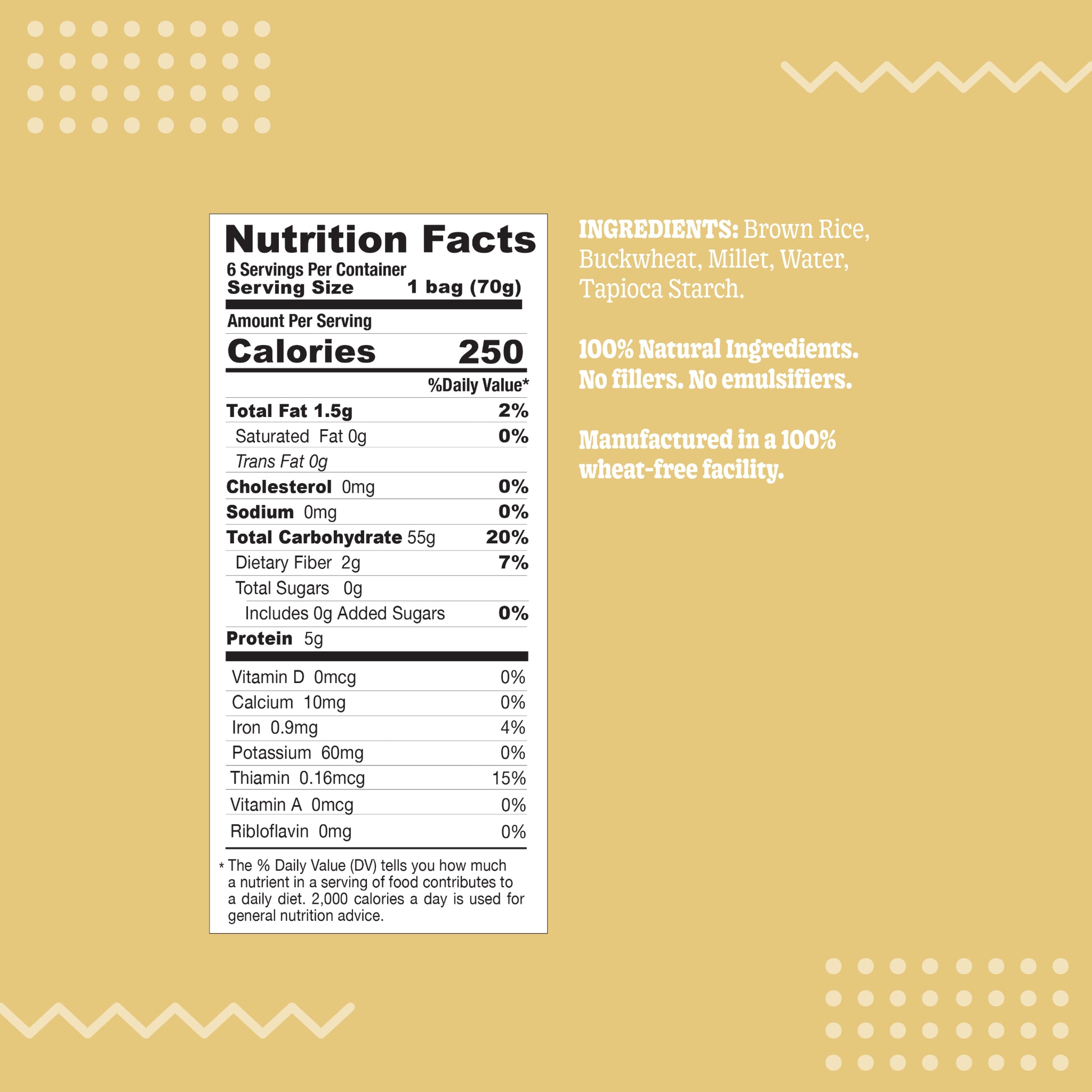Ingredients: Brown Rice, Buckwheat, Millet, Water, Tapioca Starch.